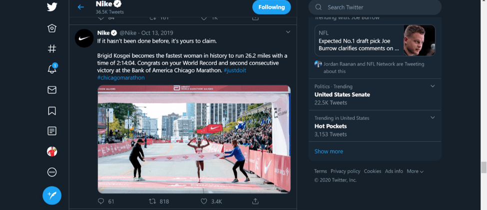 An area that Nike needs to stay consistent with is their incredible content. While other best practices may be lacking, Nike’s content is the core to their entire social media campaign. Whether it is commercial, photos, or articles, Nike finds a way to make their audience feel empowered and inspired. They almost have an expectation now that whenever you see that a Nike commercial is on TV, you are going to be left with a “WOW.” You can see in the Twitter post below that Nike not only posts about the groundbreaking accomplishments of their sponsored athletes, but they love to throw in some motivation for you as well. This is something I really admire about Nike, and to me it shows that they really live by their mission statement (Bring inspiration and innovation to every athlete in the world).